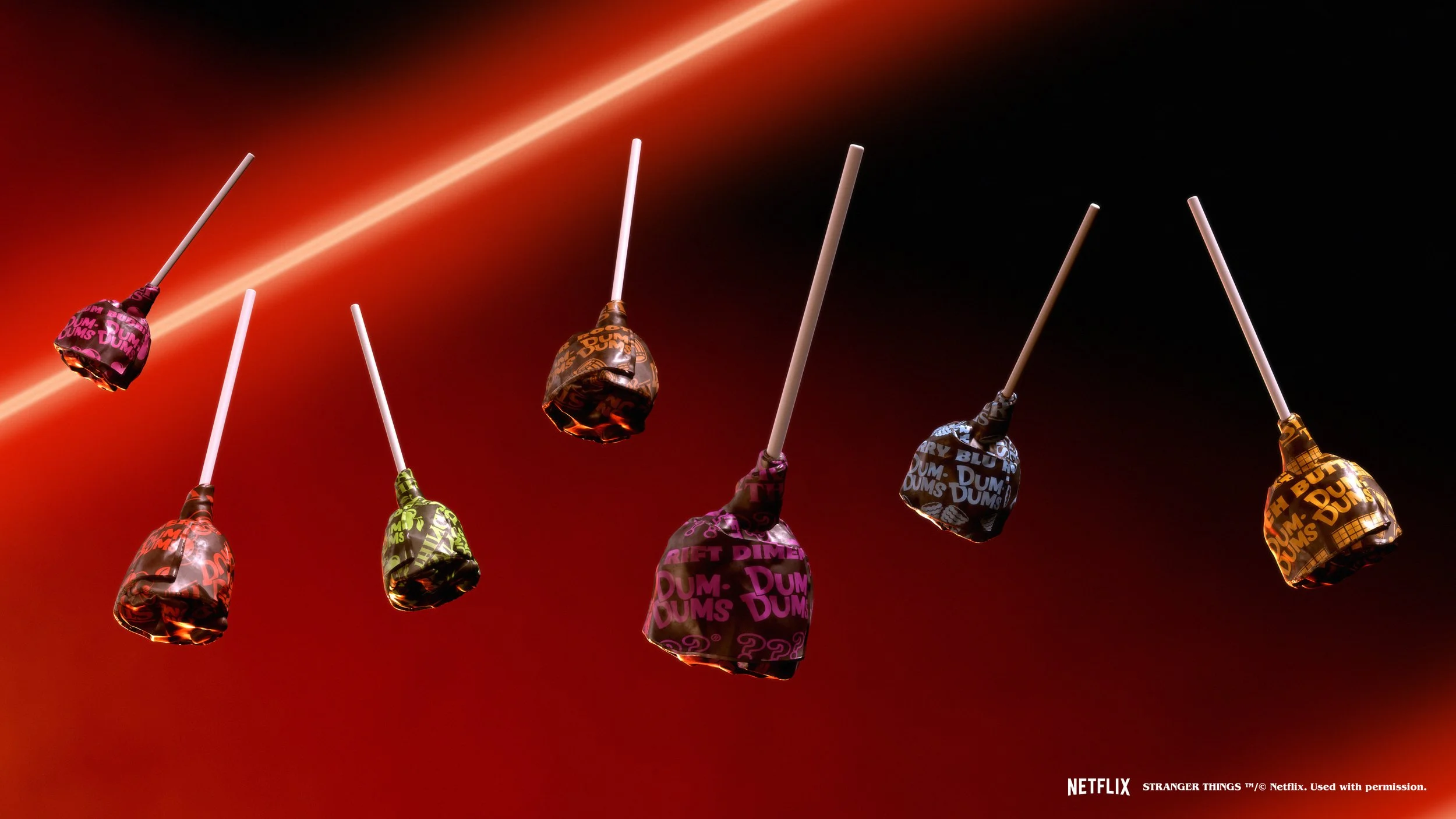 As Stranger Things returns for its fifth and final season, Netflix and Dum-Dums are celebrating with an uncanny collab. We helped take seven of their classic flavors to The Upside-Down, giving each a darker, eerier hue to represent its journey. Mystery flavor became “Dimensional Rift,” while new wrappers and packaging channeled the shadowy realm.